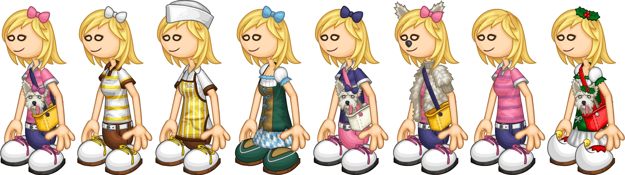 Lleva su uniforme de Papa's Pancakeria. Consiste en una camisa blanca con fine de manga marrones debajo de un delantal amarillo con rayas blancas, un borde marrón y una etiqueta de identificación, pantalones marrones, un sombrero de papel y zapatos blancos con cordones amarillos y suelas marrones.