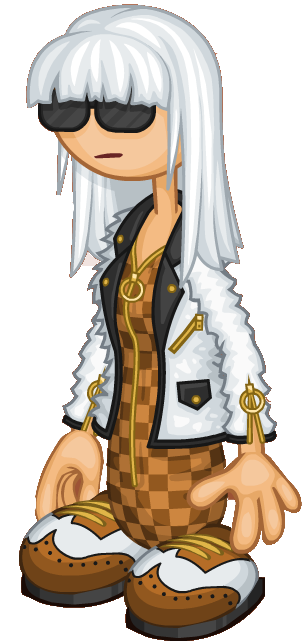 En este estilo, Whippa usa un enterizo de dos tonos marrones,de estampado de cuadros, con un zipper dorado . Ademas, viste un abrigo de piel blanco con bolsillos negros y botones y zippers dorados.