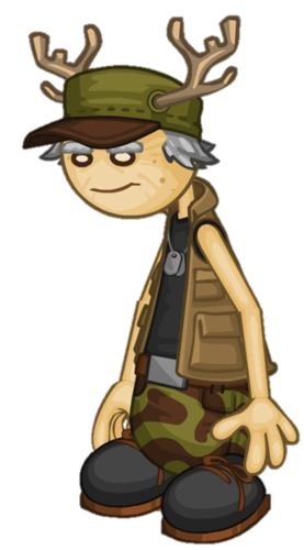 Chester nosi zieloną kamizelkę bez rękawów, brązowe spodnie, jasnobrązowy pas, zieloną czapkę z wydatnym bobrem. Czapka wygląda jak brązowa gęś.