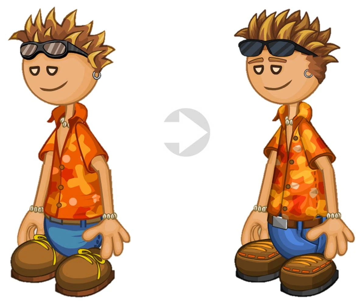 Jego ubrania zostały przemodelowane. Ma teraz również cienkie brwi i bokobrody, a jego buty zmieniają się teraz w szyte mokasyny.