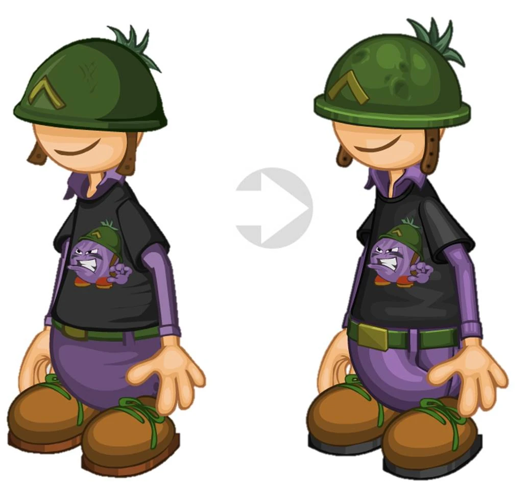 Nosi purpurowo-cebulowy sweter z twarzą Sarge i wojskowe zielone łuki na rękawach skierowane do jego ramienia oraz zielono-brązowe spodnie trzymane przez brązowy pas kamperowy.