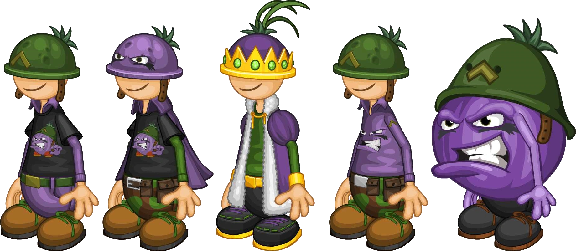 Sarge Fan podczas Onionfest w Papa's Scooperia/HD nosi fioletową szatę, zieloną koszulę z długimi rękawami, czarne spodnie ze złotym pasem oraz czarne mokasyny z purpurowymi sznurówkami i zielono-złotymi wykończeniami. Nosi też złotą koronę z cebulą.