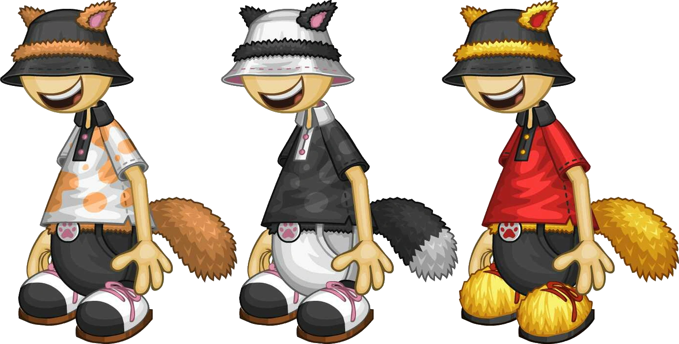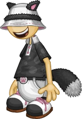 In games where he dresses up for Lunar New Year, C.J. Friskins wears a black hat with gold fur and red ears. He also wears a red shirt with a black collar and stitches and golden buttons, a golden fur belt with a red paw, a golden tail, and golden fur shoes with red laces and black soles.