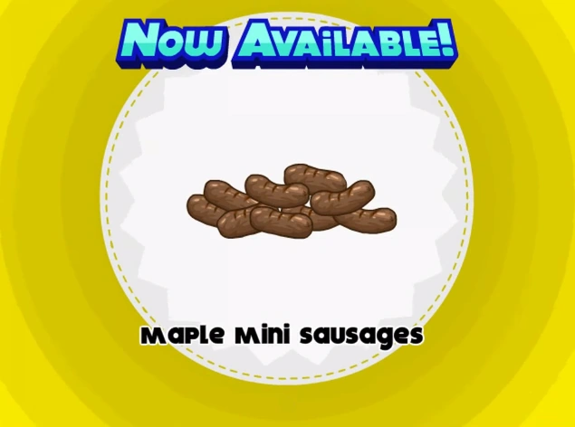 Maple Mini Sausages are holiday-exclusive toppings available during Maple Mornings in Papa's Cheeseria. They are unlocked with Cooper when the player reaches Rank 26.