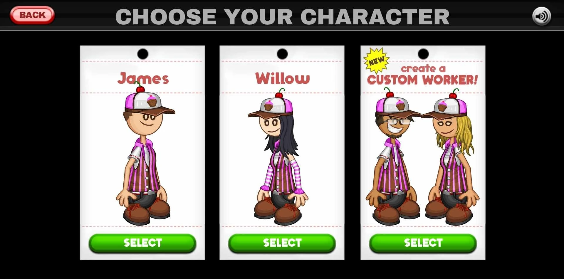The workers in this game are James, Willow, and the Custom Worker. The default uniform is identical to that of its predecessors and consists of a white shirt, a brown and pink vest, black pants, a brown, pink, and white belt, brown shoes with red laces and black soles, and a brown, white, and pink hat with a cupcake on the front and a cherry on top.