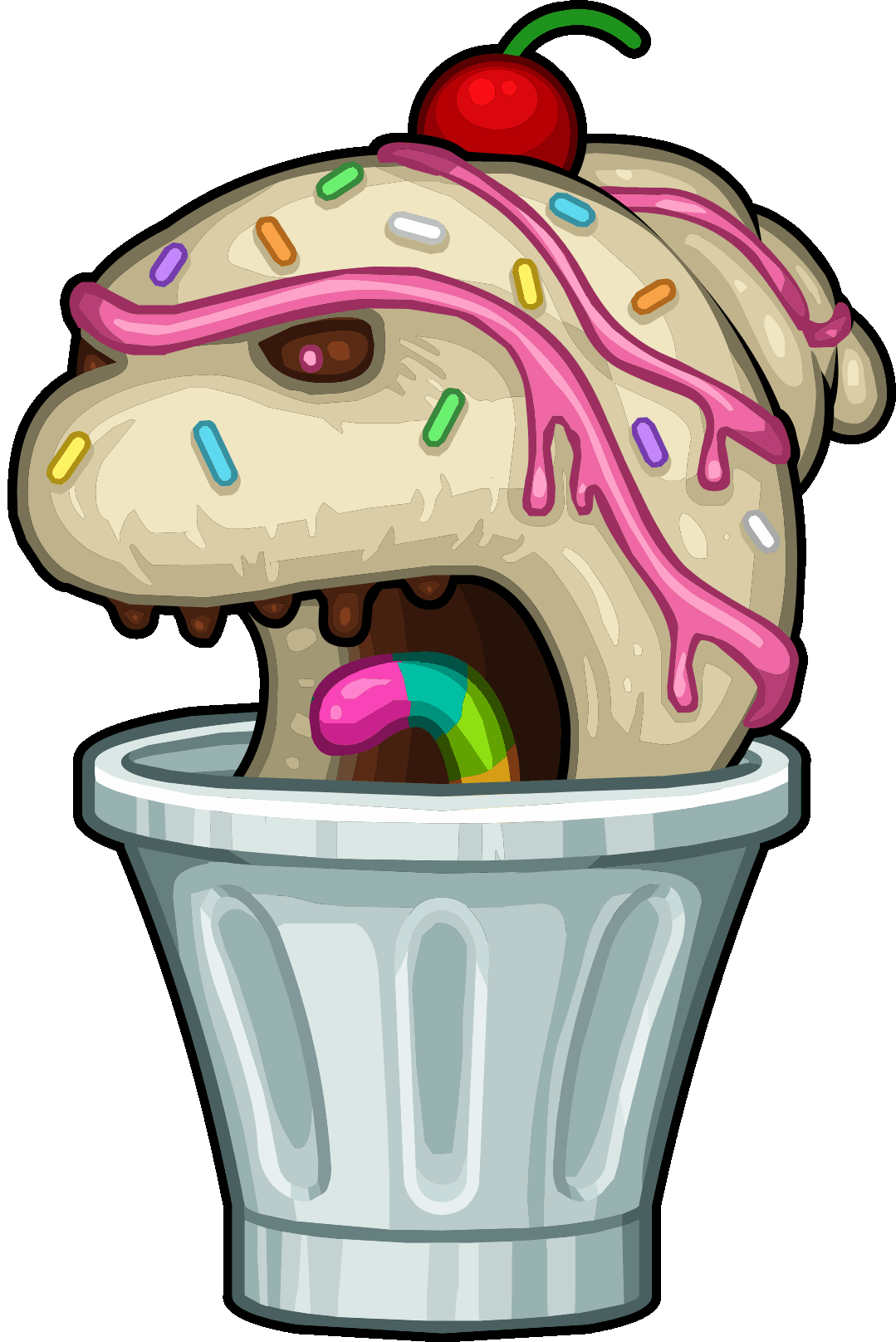 SundaeSauruses are large angry vanilla sundae monsters that have a large mouth that never closes, chocolate balls for eyes with glowing magenta pupils. They have a visible Gummy Worm that acts as its tongue and dripping chocolate syrup that resembles teeth. The top of its head is covered in strawberry drizzle, sprinkles, and a single cherry on top. It carries around a glass cup for both protection and as its form of transportation.
