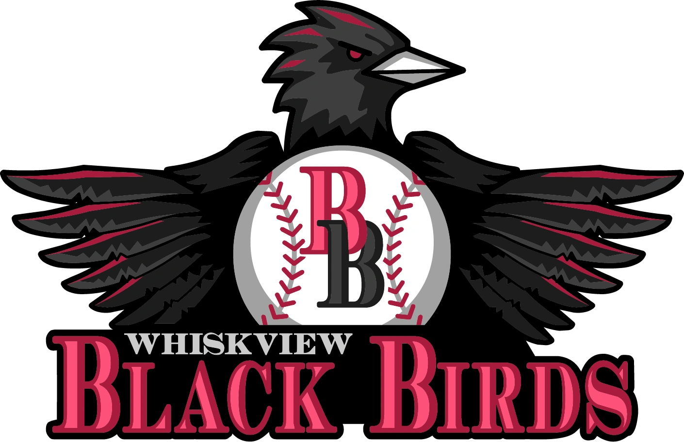 The team colors are black, white, and cabernet and their logo features a black bird with cabernet streaks in its feathers, white beak, and a baseball with two chained Bs (one hot magenta and one black) on it.