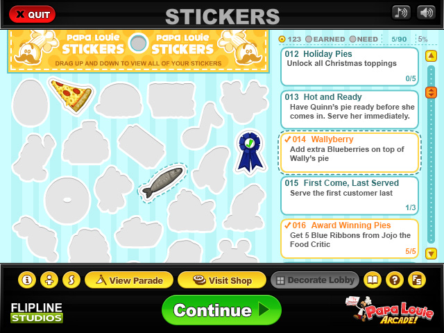 现在你可以开始搜集大量Papa Louie的贴纸。有些承继了旧版成就的任务像是获得蓝缎带5次或解锁所有圣诞节配料。不过我们提高了一个档次,加入指定的任务和挑战,让你自由选择你下次想获的哪张贴纸。
