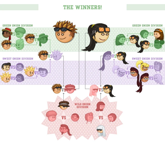 这个为期一个月的比赛将以OnionFest国王和王后的加冕为高潮。 每回合将看到来自男女方括号的两个有价值的顾客争夺他们在OnionFest皇家宫廷中应有的地位。